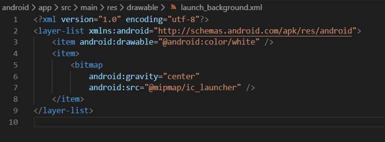 <?xml version="1.0" encoding="utf-8"?> <!-- Modify this file to customize your launch splash screen --> <layer-list xmlns:android="http://schemas.android.com/apk/res/android"> <item android:drawable="@android:color/white" /> <!-- You can insert your own image assets here --> <!-- <item> <bitmap android:gravity="center" android:src="@mipmap/launch_image" /> </item> --> </layer-list>This is the file layout for the splash screen.