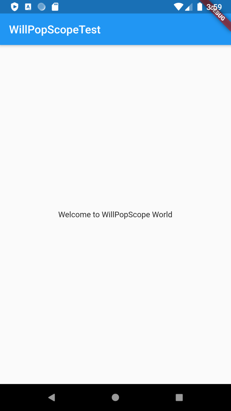 // 1. Scaffold wrapping with WillPopScope import 'package:flutter/material.dart'; void main() { runApp( MaterialApp(home: MyApp()) ); } class MyApp extends StatefulWidget { @override _MyAppState createState() => _MyAppState(); } class _MyAppState extends State<MyApp> { String _msg = 'Welcome to WillPopScope World'; @override initState() { super.initState(); } @override Widget build(BuildContext context) { return WillPopScope( // <- WillPopScope로 감싼다. onWillPop: () { setState(() { _msg = "You can not get out of here! kkk"; }); return Future(() => false); }, child: Scaffold( appBar: AppBar( title: const Text('WillPopScopeTest'), ), body: Center( child: Text(_msg), ), ), ); } }// 2. Put WillPopScope in the body of Scaffold import 'package:flutter/material.dart'; void main() { runApp( MaterialApp(home: MyApp()) ); } class MyApp extends StatefulWidget { @override _MyAppState createState() => _MyAppState(); } class _MyAppState extends State<MyApp> { String _msg = 'Welcome to WillPopScope World'; @override initState() { super.initState(); } @override Widget build(BuildContext context) { return Scaffold( appBar: AppBar( title: const Text('WillPopScopeTest'), ), body: WillPopScope( // <- Scaffold body만 감싼다. child: Center( child: Text(_msg), ), onWillPop: () { setState(() { _msg = "You can not get out of here! kkk"; }); return Future(() => false); }, ), ); } }execution result