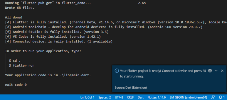 When the project creation is complete, you will see the message "Your flutter project is ready. Connect the device and press F5 to start running".